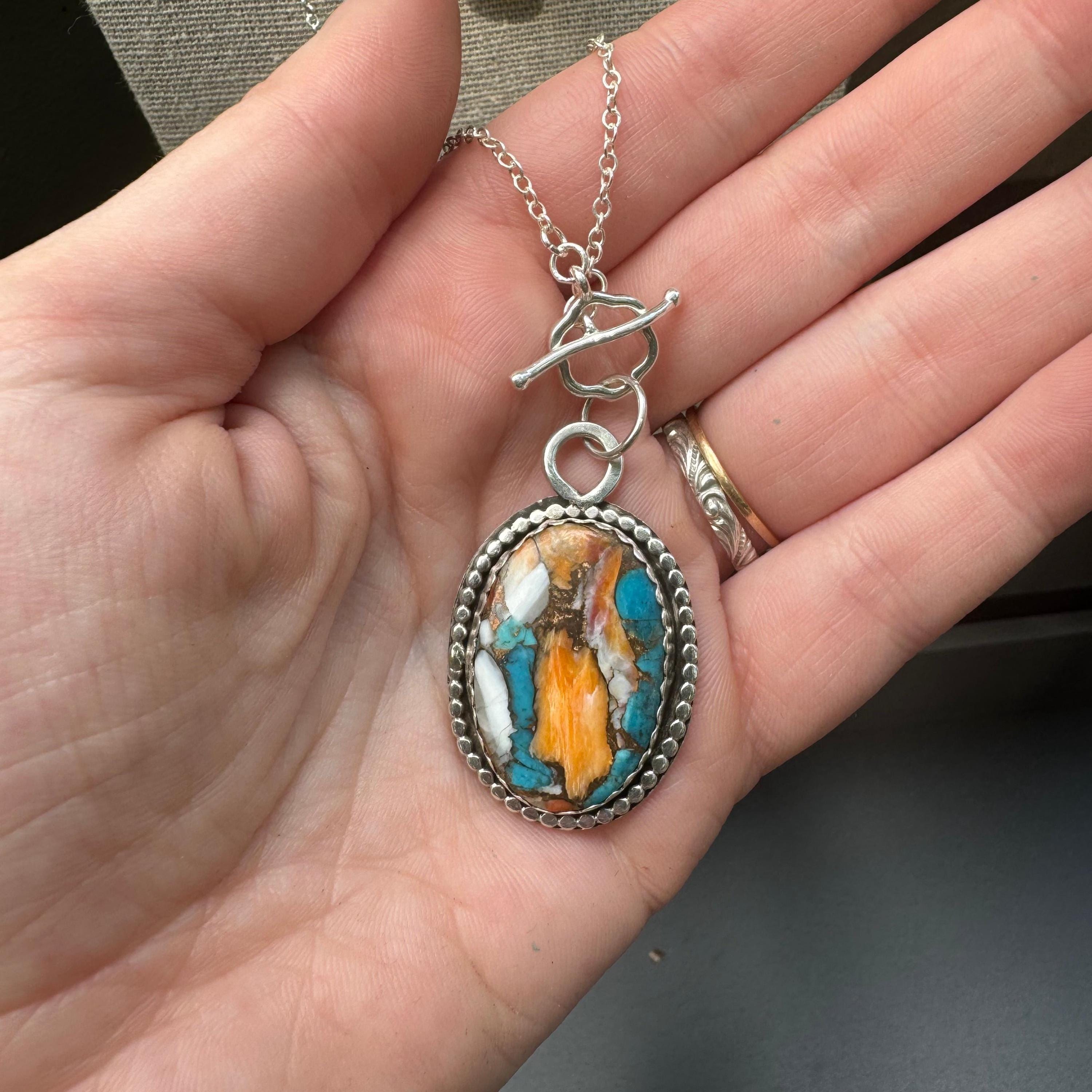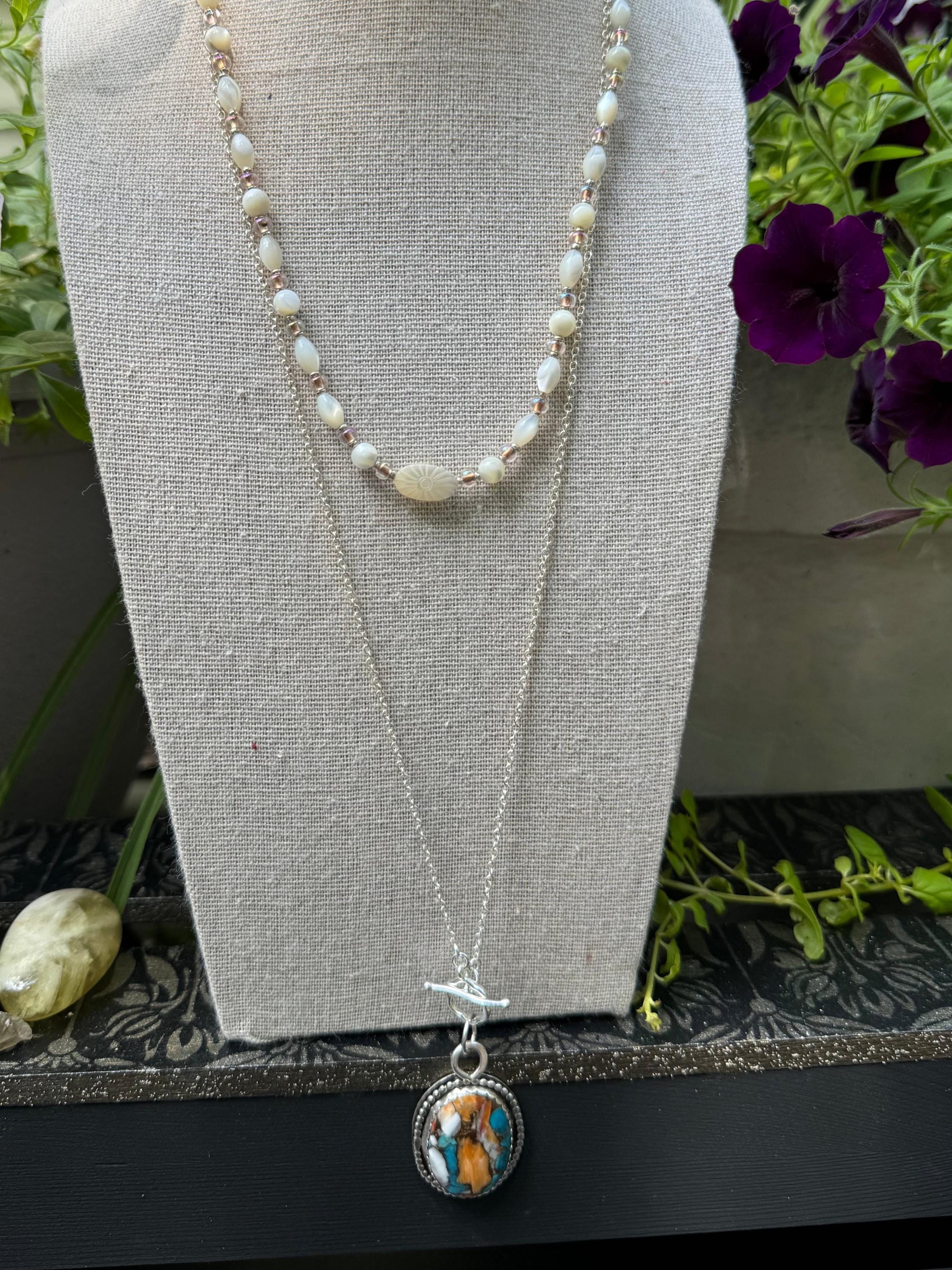 The beauty in this Spiny Oyster Turquoise Gemstone is breath-taking!Made with:.999 Fine Silver Bezel inside .925 beaded wire.925 Sterling Silver Toggle Clasp24" .925 Sterling Silver Rolo Chain (purchased from supplier-not handmade by me)